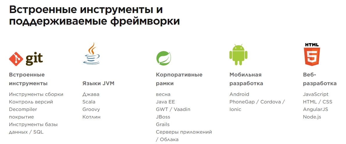 Критически важные инструменты, такие как интегрированные системы контроля версий и широкий спектр поддерживаемых языков и сред - все под рукой - без проблем с подключаемыми модулями.