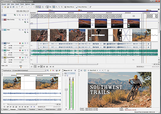 C Vegas Movie Studio Вы сможете сделать из них клипы или целые фильмы с контролем времени на графике, добавить разнообразные эффекты, переходы, делать надписи и музыку.